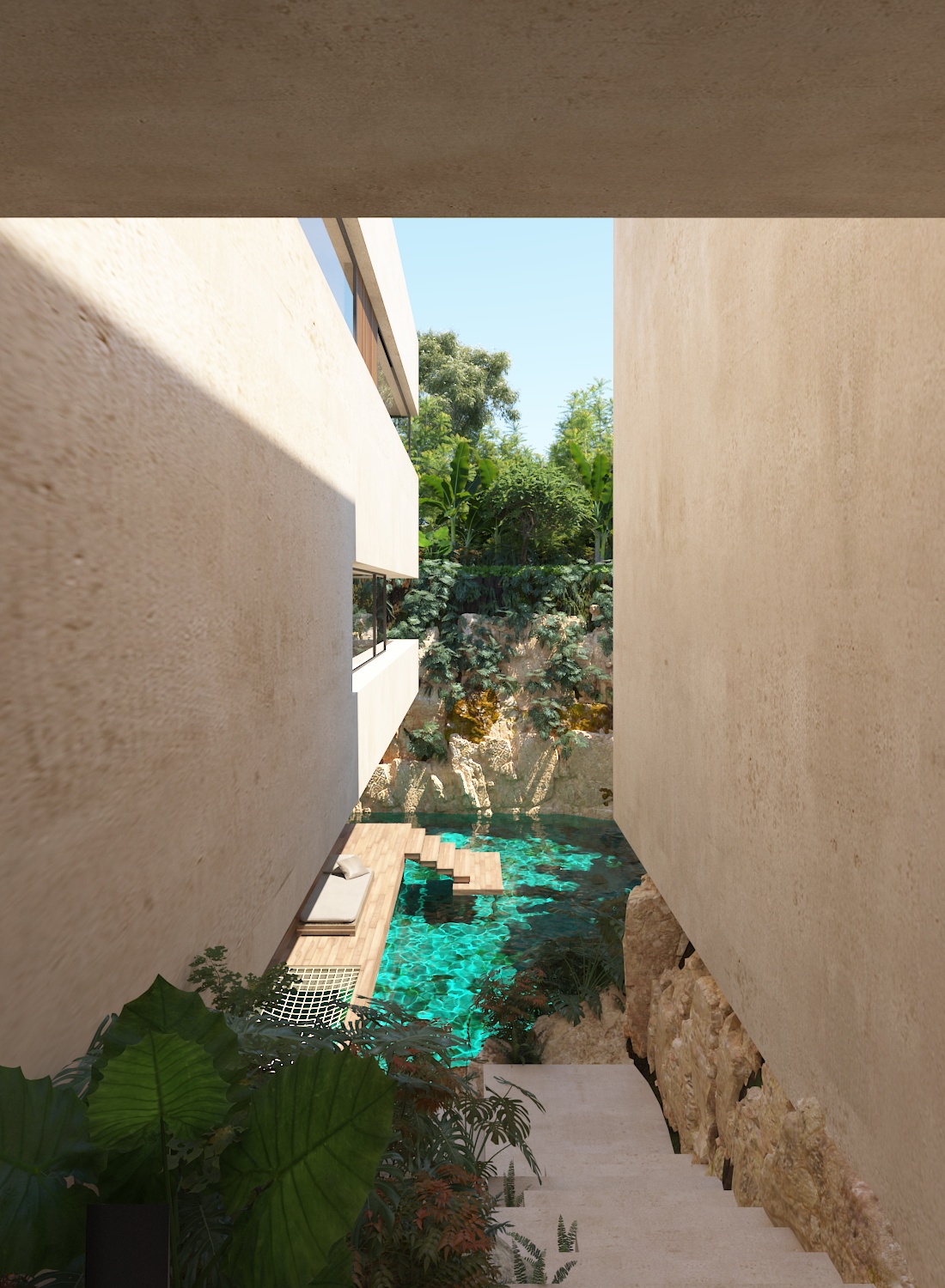 En la nueva etapa del prestigiado desarrollo Puerto Aventuras en la Riviera Maya, ésta residencia de 4 habitaciones, se inspira en las casas construidas anteriormente en zonas como el pedregal. Entrando por un acceso escalonado y después descendiendo al corazón del proyecto, llegamos al área de doble altura que después se abre al cielo y a su vez hacia el cuerpo de agua.